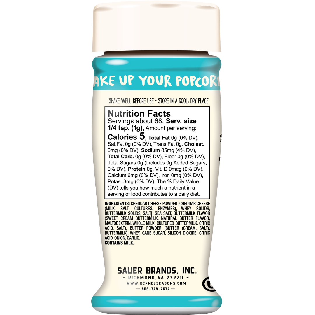 Kernel Season's Aged White Cheddar in a gourmet blend is the ninja of flavors, and in a better-for-you blend. You can’t see it on popcorn, but it delivers a big, tangy real cheese punch. This low calorie flavor powerhouse is also the perfect addition to steamed veggies, chicken and potatoes.