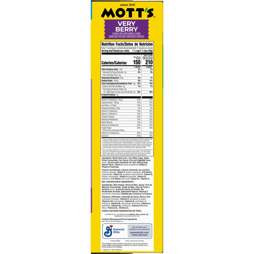 Mott's Very Berry Cereal is the perfect pick to start your day! These sweetened crispy corn puffs are a delight for the whole family. This delicious cereal is made without colors from artificial sources or artificial flavors. Each serving has 16g of whole grain (at least 48g recommended daily) and 12 vitamins and minerals. This sweet and yummy cereal is made with apple puree (made with apple puree concentrate; see full ingredient list; not intended to replace fruit in the diet). Enjoy a bowl with milk as part of a quick and easy breakfast, or pack a couple of handfuls in a bag for an on the go snack. Keep a box in the pantry to create no-bake cereal bars with a sweet berry flavor. No matter how you eat these crunchy, crispy corn puffs, treat yourself to the taste of Mott's! Contains one 21.6 oz cardboard box of crunchy Mott's Very Berry Cereal, made with apple puree, family size; perfect for instant snacking or a part of breakfast and meals.