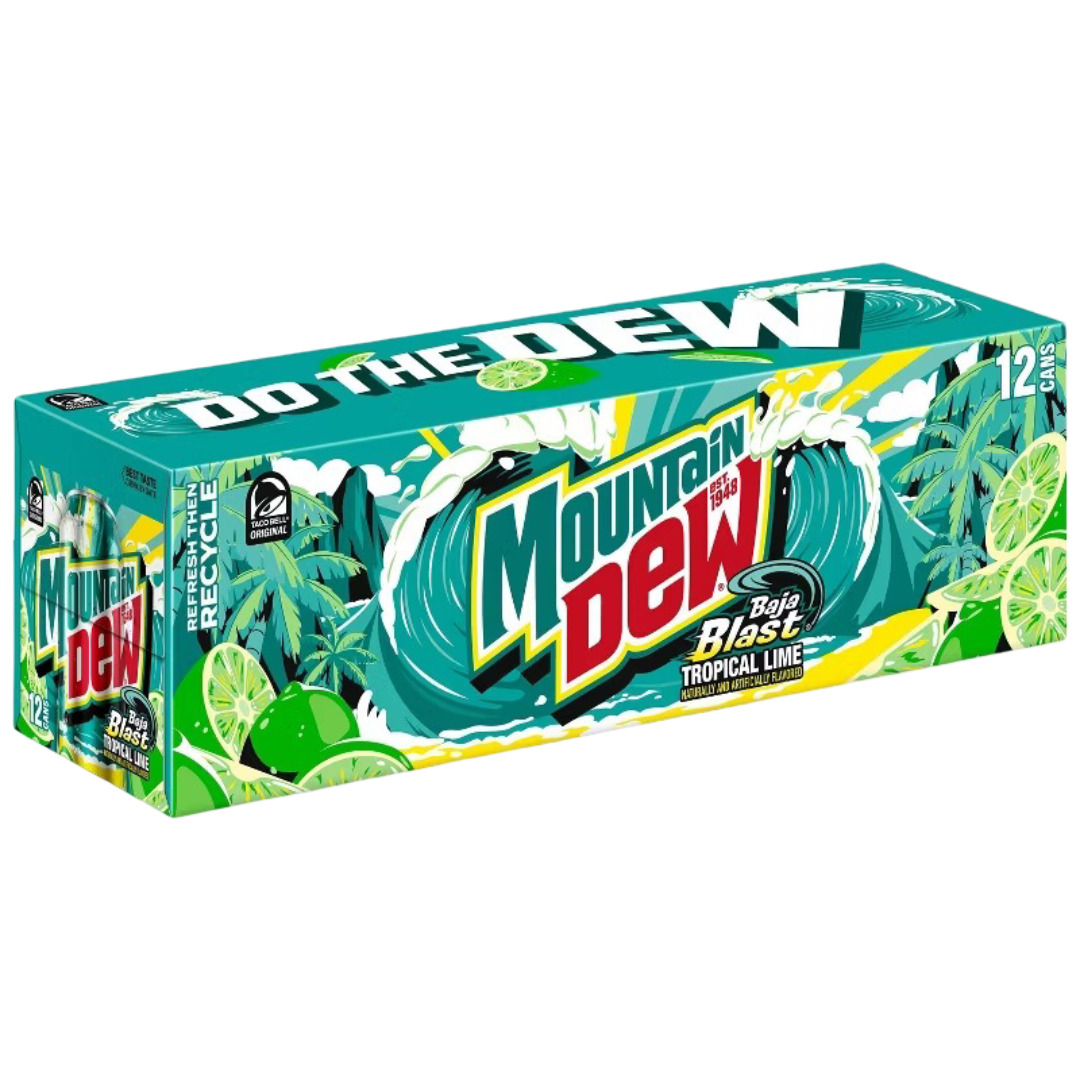 Includes 12 cans of Mountain Dew, Baja Blast flavor