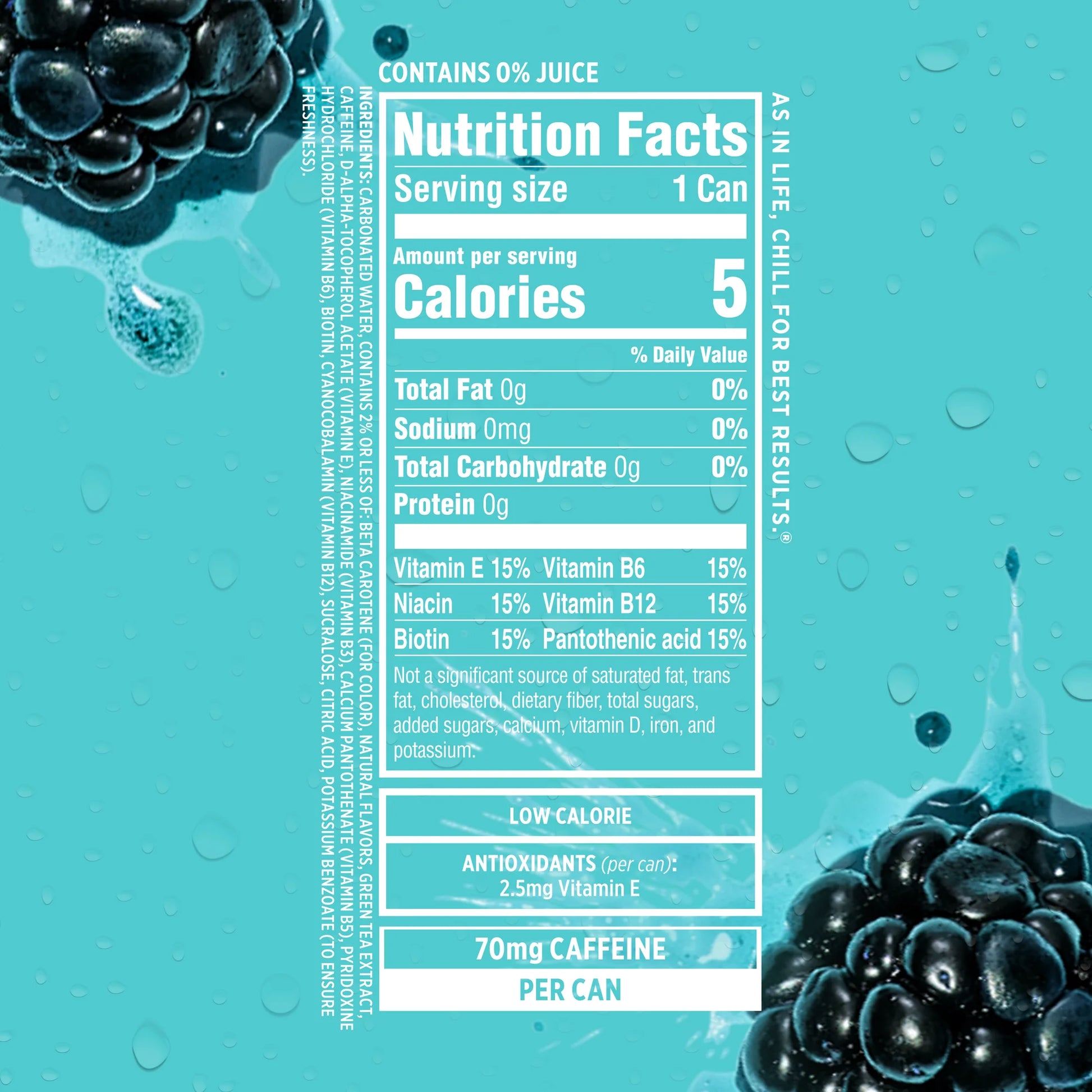 Sparkling Ice® +Caffeine, Blue Raspberry Flavored Sparkling Water with Caffeine, Zero Sugar, with Vitamins and Antioxidants, Low Calorie Beverage, 16 fl oz Can. When sweet meets tangy and a little oomph of caffeine, you get Sparkling Ice +Caffeine in Blue Raspberry. Sparkling Ice +Caffeine Blue Raspberry is a fizzy, flavorful sparkling water, with zero sugar, only 5 calories per can and 0g carbs. Made with better-for-you ingredients, this low-calorie carbonated water is bursting with real fruit flavor, is made with colors and caffeine from natural sources, contains vitamins and antioxidants, and gives you a little extra boost.